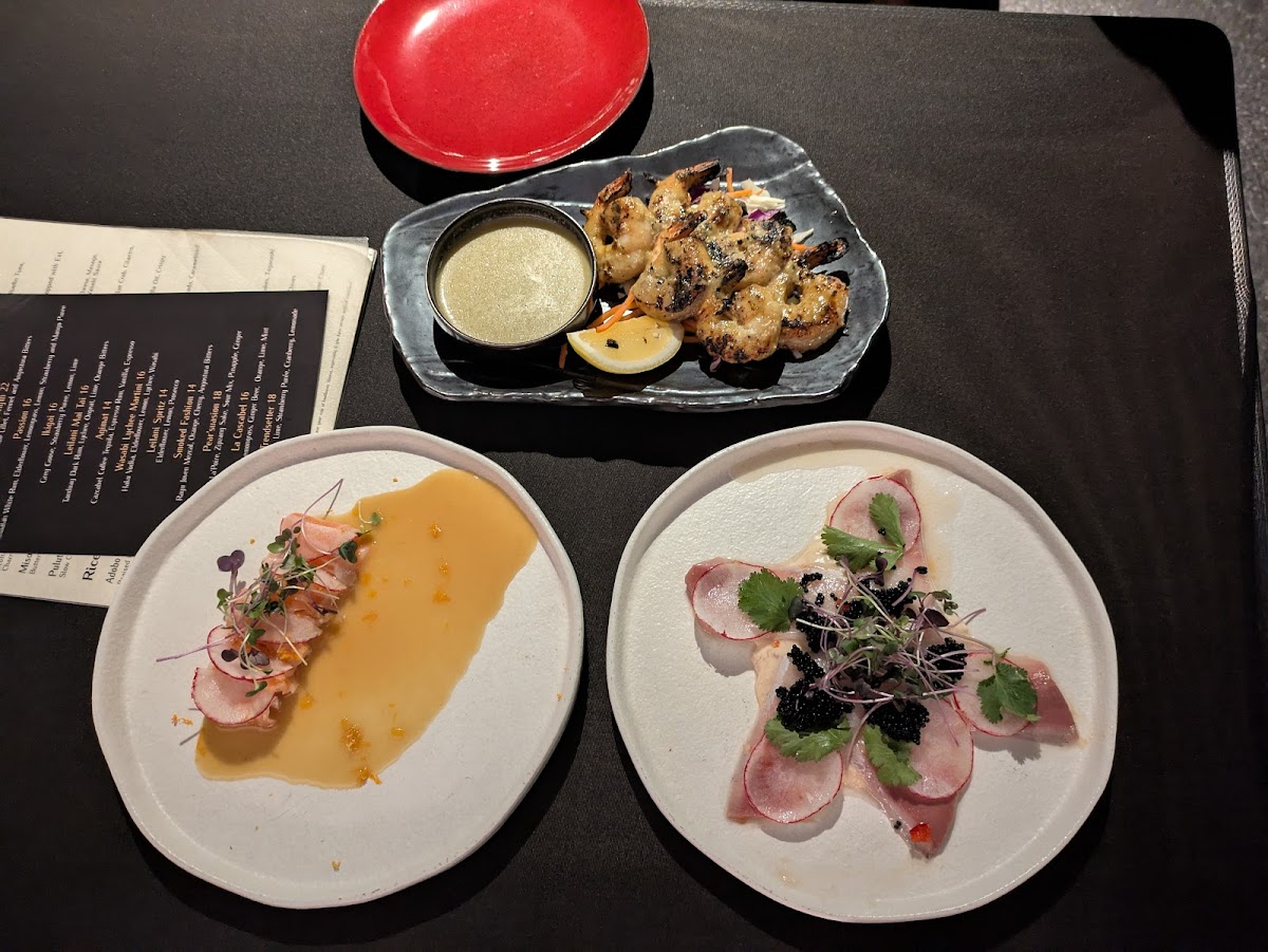Salmon and Scallop Crudo, Shiso Leaves, Olive oil, Ponzu, Pickled shallots